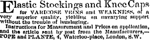 Elastic Stockings and Knee Caps for VARICOSiC VKINS nnd WEAKNESS , of a very superior quality , yielding on uuvaryliig Hiijiport without tlio trouble of handaglnK . InstruotloiiH for Moasuriimont mid PrlcoH on application , nnd the nrtlclo nont by post from tho Manufacturors , — POPE anU PLANTK , 4 , Wntorloo-placo , London , 8 . W .