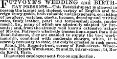 TjMJTVOYE'S BEDDING and BIETHJL DAY PRESENTS—This Establishment is allowed to possess tho largest and choicest variety of English and foreign fancy goods , both valuable and Inexpensive , constating of Jewellery , watches , clocks , bronzes , dressing and wiithi K cases , funcy , leather , pearl and tortoiseshcll goods , papier macho , & c , many of wliich are admirably adapted for presents ; and . from tho already well known extensive nature of Messrs . 1 ' utvoyo ' s wholesale transactions , apart from this Establishment , they aro enabled to supply tho bost -workmauHhip , combined with moderate charges , which , it / is scarcol v nocoswary to state , canonlybooll ' ccted in such cases Retail , 154 , ltegont-strcot , corner of Beak-street- Wholesale and Export Warehouse , 28 and 20 , Silver-street ; 34 , Uuo do Rivoli , Pnris . Illustrated catalogues sent free on application .