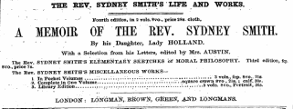 THE REV . SYDNET SMITH'S LIFE AND WORKS . Fourth edition , in 2 vols . 8 vo ., price 28 s . cloth , A MEMOIR OF THE REY . SYDNEY SMITH , By his Daughter , Lady HOLLAND . With a Selection from his Letters , edited by Mrs . AUSTIN . The Rev . SYDNEY SMITH'S ELEMENTARY SliiBTCHUS of MORAL PHILOSOPHY . Third edition , ftp . 8 vo ., price 7 s . . The Eev . SYDNEY SMITH'S MISCELLANEOUS WORKSl Tn PnnVot Vnlnmpn " . ...:. ...... ; 3 VOla ., fCP . 8 VO .. 218 . \ . Complete in On " Volume / . ¦ . •' . :. . . V . . square crown 8 vo , 21 s . ;; calf . 30 s . 3 . Library Edition - .... 3 vols . 8 vo ., Portrait , 36 s . .. ¦ — ¦ LONDON " : LONGMAN ,. BROWN , GfiEEtf , & 8 TD LONGMANS .