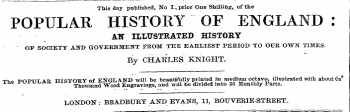 This day published , No I , price One Shilling , of the POPULAR HISTORY OF ENGLAND : AW ILLUSTRATED HISTORY OF SOCIETY AND GOVERNMENT FROM THE EARLIEST PERIOD TO OUR OWN TIMES . By CHARLES KNIGHT . The POPULAR HISTORY of ENGLAND will be beautifully printed in medium octavo , illustrated with about 0 n me i-ut-UL . AU iiioA ^ ^ Wood Engravings , and will be divided into 36 Monthly Parts . LONDON : BEADBURY AND EVANS , 11 , BOUVERIE-STREET .