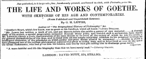 Just published , in 2 large rots ., 8 vq , handsomely printed , and bound in cloth , with Portraits , price 30 * . THE LIFE AND WORKS OF GOETHE . WITH SKETCHES OP HIS AGE AND CONTEMPORARIES . ( From Published and Unpublished Sources ) . By G . H . LEWES , Author of " The Biographical flistory of Philosophy , " & c . <• Goethe ' s Heart , which few knew , was as great as lii 3 Intellect , " which' all kriow . . " -Jomci St « . hng . "A more ftvitlilul and lifo-liUo biography than thia wo have rarely read . "— Literary Uazcile . LONDON : DAVID NUTT , 270 , STRAND .