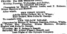 PRICES : For ^ SIX NIGHTS OWJr . Monday . Tuesd ^ m ^ es ^^ P ^ day , Characters by Messrs ; Emery , Leslie , and T . Robson ; Misses Marston and JIaskell . , After which , the TIRST NIGHT . Aohitte . Talma Duford , Mr . A . Wigan ; Rose Dufard , Miss Julia St . George . To co » ol » d * ^ fi TBLM > W ij ( VrARp . ^ Characters by Messrs . F . Robsoa , Daavers . Gbitoa , Witttew ff . Cooper , Mrs . FitaaUan , Misses- Marston , BroMley , Hughes , and Julia St . George . Thursday , Mr . F . Robson ' s Benefit . Saturday . Mr . Allred Wigan ' s Benefit , and Lasfc Night of the Olympic Company .