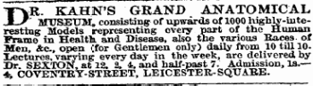 XVR- KAHN'S GRANI > ANATOMICAL . P 9 ' MUSEUM , consisting of upwards of 1000 highly-interesting Models representing overy part of the Human Frame in Health and Disease , also the various Races- of Men , & c open ( for Gentlemen only ) daily from 10 till 10 . lectures , varying every day in the week , are delivered , by Dr . SEXTON , at 12 , 2 , 4 . and half-past 7 . Admission , la . — * , COVENTRY-STREET , LEICESTER-SQUARE .