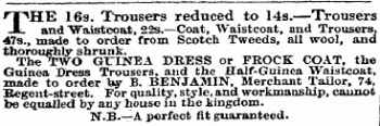 THE 16 s . Trousers reduced to 14 s . —Trousers and Waistcoat , 22 s . —Coat , Waistcoat , and Trousers , 47 s ., made to order from Scotch Tweeds , all wool , and thoroughly shrunk . The TWO GUINEA DRESS or FROCK COAT , the Gninea JDress Trousers , and the Half-Guinea Waistcoat , made to order by B . BENJAMIN , Merchant Tailor , 74 , Regent-street . For quality , style , and workmanship , cannot be equalled by any house in the kingdom . N-B- —A perfect fit guaranteed .