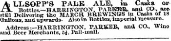 AtLLSOPP'S PALE ALE * iu . Casks or IrL Bottles . —HARRINGTON , PARKRB ,, . and ca . ace . still Delivering the MARCH BREWINGS m Casks of 18 Gallons , and upwards . Also in Bottles , imperial measure Address : —HARRINGTON , PARKER , and . CO ., Wine and Beer Merchants , Cj , Pall-mall .