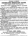 FITCH 8 c SOU'S CELEBRATED BREAKFAST BACON , AWD FIRST-CLASS PROTISIONS . EXTRACTS FROM CORRESPONDENTS' LETTERS , COKTIKCKD . " We were much pleased with the quality of No . 9 case . The bacon , & c , wo found first-rate . '—Melbourne , South Australia . _ _ ,-,- ,-" I beje to enclose you a Post-office order for It . 5 s . ( Id- for bacon ; the quality is very excellent , and quite to mv taste . " " I like the cheese much , and I have no doubt the bacon will prove as good as in former times . " " The bacon you sent me is excellent ; I shall recommend " I never tasted such bacon in my life ; it was delicious . " " The Rev . bogs to enclose Fitch and Son 1 / . Is . lOd . forbacon received this nioming . and found vory nioeindeed . " " I am obliged by your attention to the small order , and for the excelLcut article supplied . . Enclosed are postage stamps for the amount . " Fitch and Son will be gratified by showing , the originals of the above , and a multitude of others of tho lite import , upon application- ,,,.., This'cetebr & ted bacon is sold by tho side and half-side at lOd . per lb . ; the middle piece of 12 lbs . at lOJd . per lb . ; and other separate pieces . Bacon , hams , tongues , German sausages , cheese , butter , & C-, securelv packed for travelling , and delivered free of charge , at ail the Loudon Termini . List of prices free . See also daily papers . PosUofQce Orders to be made payable at St . Martiu's-le-Grand . Prepayment is requested where a reference is not sent with the order for goods . FITCH AND SON , Provision Merchants and Importers , No . GC , BISHOPSGATE WITHIN , LONDON . Established 178 i .