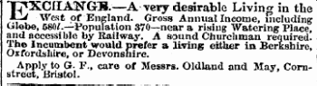 'rjTKGIIAKGB . —A very desirable Living in tbe -Li West of England . Gross Annual Income , including Glebe , 58 M . —Population 370—near a rising Watering Place , and accessible by Railway . A sound Churchman required . The Incumbent would prefer a living either in Berkshire , Oxfordshire , or Devonshire . Apply to G . F ., caro of Messrs . Oldland and May , Cornstreet , Bristol .