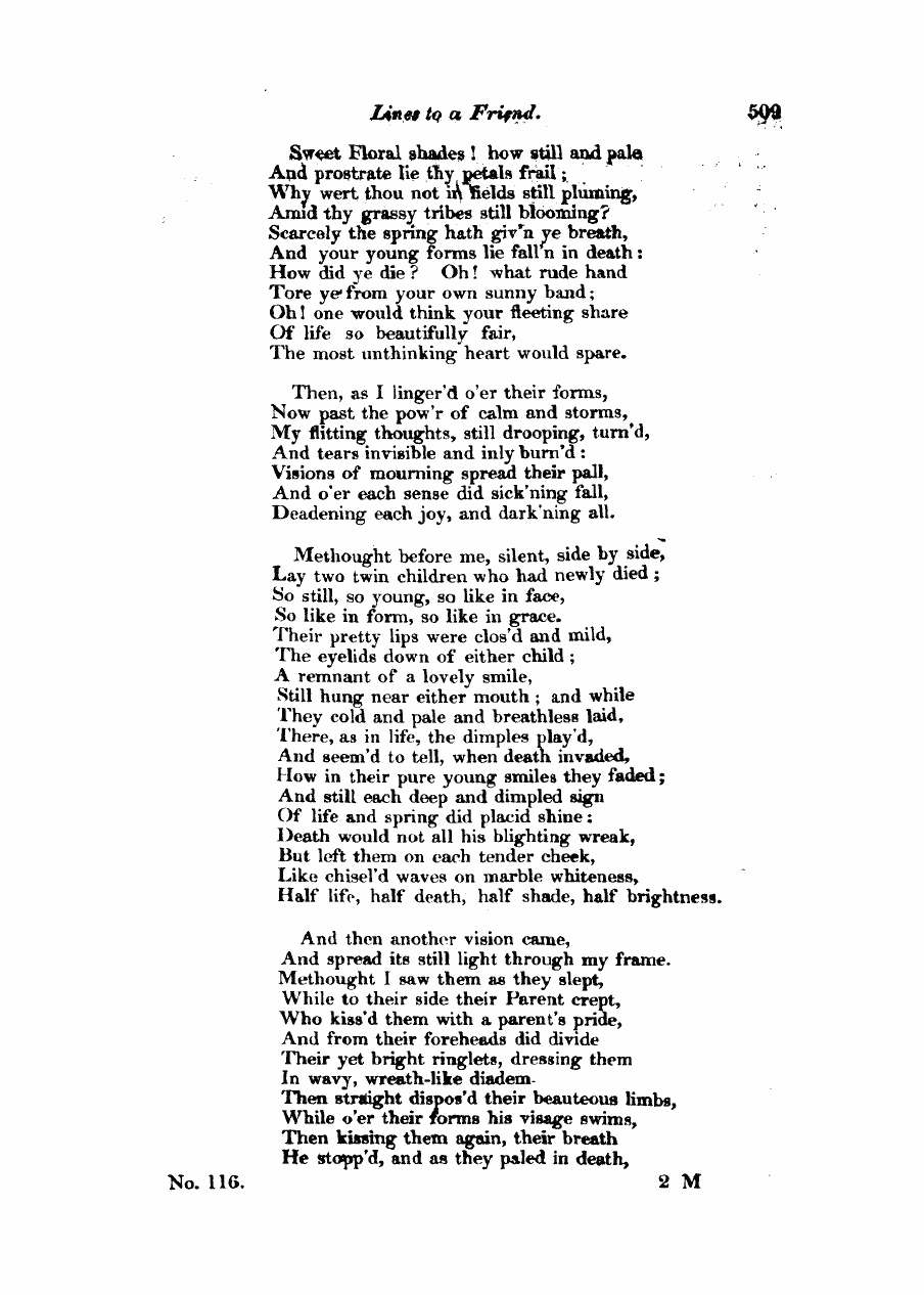 Scarcely the spring hath giv n ye breath , And your young forms lie fall n in death : How did ye die ? Oh ! what rude hand Tore ye * from your own sunny band ; Oh ! one would think your fleeting share Of life so beautifully fair , The most unthinking heart would spare .