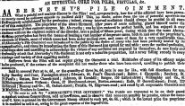 j ^ EFFECTUAL CURE FOR PILES , FISTULAS , & c . M UFRNETHY'S PILE OINTMENT . mi ? . « .. mmland noxious disease is the Piles ! aud , comparatively , how few of the afflicted have beenperma-„ «^^ £ S » Tappeals to medical skill ! This , no doubt , arises from the use of powerful apenente too Sfe ^ nfnX ^ nnds ^ Vtte profession ; indeed , strong internal medicines should always be avoided in all cases ^ fe cS m nlatar ^ proprietorof the above Ointmen t , after years of acute suffering placed himself under the !« JS 3 ihat eminent surgeon . Mr . Abfrnethy ; was by him restored to perfect health , and has enjoyed it ever ; S ^^ ont the shghtestreturaofthedlsorfer , overa ]^ od of fiiteenyears , during which time fte same Aberaeffi ^ an n ^ riprionbasbeen the means oi healing a vast number of desperate cases , both in aud ontof the proprietor ' s , ic & drcleofrnends , most of which cases bad been under medical care , and some of them for a very considerable time . AtAtenethv » sKIe Ointment was introduced te the public by the desire uf . many who bad been perfecfly healed by its i armpnlicarion , and since its introductten the fame of this Ointment has spread far and wide ; even the medical profession , i sSi slow and unwilling to acknowledge the virtues of any medicine not prepared by themselves , do now freely and ifeftanHy admit that Abernethy ' s Pile Ointment is not only a valuable preparation , but a never failing remedy in every i stostage and variety of that appalling malady . * - . ' -. i Sufferers from the Piles vrill not repent giving tbe Ointment a trial . Multitudes of cases of its efficacy might Ibebe produced , if the nature of the comp laint did not render those who have been cured , unwjlhng . to publish their "T ' sold in covered Pots at 4 s . 6 tL . or the quantity of three 3 s . 6 d . pots in one for lis ., with full directions for use , oiby Barclay and Eons , Farringdon-street ; Edwards , St Paul ' s Church-yard ; Bulter , i Cheapside ; Newhery , St PiPaul ' s ; Sutton , Bow Chnrch-yard : Johnson , 68 Cornhill ; Sanger , 150 Oxford-street Willonghby and Co ., 61 BiBisho * sgate-street Without ; Owen , 52 Marehmond-street , Burton-crescent ; Bade , o 9 Goswellstreet ; Pront , 229 SlStrand ; HannayandCo ., 63 , Oxford-street ; Prentis , 8 t , Edgeware-road ; and retail by all respectable Chemists and ^^ B ^ Soli ^ ^ ABERSBTHT' 3 PItE OINTMENT . " The Public are requested to be on their guard 8 i against noxious Compositions , sold at low ^ rices , and to observe that none can possibly be genuine , unless the name 3 ScKKGisprmtedoa the Government Stamp affixed to each pot , 4 s . 6 d . ; which is the lowest price the proprietor is is enabled to sellit at , owing to the great expense of the Ingredients .