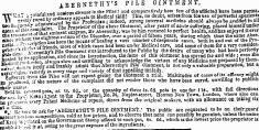ABERNETHY'S PILE OINTMENT . . r -i j r , nWnn « d £ « ease is the Piles ! and comparatively how few of the afflicted have been _perma-TTHXT i painful _? _-n _^^ ° _» " eais to Medical Skill ! Tbis , no doubt , arises from the use of powerful aperients W * _if _*^ r e _^ e tt . _^ _tTbythe _Professien ; indeed , strong internal medicine should always be avoided in all too _frc-jjueat ' T admin-si : er proprietor of lhe above Ointment , after years of acute suffering , placed himself under ease s of this COI ? 'i , * rhrl ; Iient _sureeon , Mr Abernethy , was by him restored to perfect health , andha 3 enjoyed it ever fee _traatm _<* Qt or _^ _wst return of the Disorder , over a period of fifteen years , during which time the same _Abergincc : _inborn ines % _beEnt _jj emegns 0 f heating a vast number of desperate cases , both in and out of the _Prone thi _. _,-. i - ? " '; ' . ( r f friends most of which cases had been under Medical care , and some of them for a very consider . j ri _« !' _-r s " 4 , _prne _-wg Pile Ointment was introduced to the Public by the desire of many who had been perfectly _^ J _^ _rit-VooHcation and since its introduction , the fame of this ointment has spread far and wide ; even the _iesJrti vy \ _.-^ vy _^ _ai _^ _ys slow and unwilling to acknowledge the virtues of any Medicine not prepared by _themjltO . c . i - .- ¦ > _ j - franklv admit that Abernetby ' s Pile Ointment , is not only a valuable preparation , but a _SwTr _^ _tfri _' - \* mei \ m ev « y sti _e and variety of that appalling malady . . B . X ' s ' from the Piles will not repent giving the Ointment a trial . Multitudes of cases _ofifa efficacy might _terrudn-.-Brl , if the nature of the complaint did not render those who bave beea cured , unwilling to publish _•^ _vf _^ _cc-e red TJots , at 4 s . 6 d , or the quantity of three 4 s . fid . pots in one for lis :, with full directions J , "; . ' ..,- _XltOlA-rent tothe Prop rietor ) , No . 3 t , Napier-street , Hoxton New Town , London , where also can te r . cu « ' _l every Patent Medicine of repute , direct from the _original mahera , uith an allowance 00 taking SIX V - _^ _s- _' -e _+ o a * for ' ABERNETHY'S PILE OINTMENT . ' The public are requested fo bo on theirguard a-J . J'XXiou ' < . compositions , sold at low prices , and to observe tbat none can possibly be genuine , unless thename ir vi ' v - U ' " - ' -terl on the Government Stamp _afised to each pot , is . 6 < L , which is the lowest price the proprietor is _mafc-Vj -X a \ _- 'i " it at , owimj to the great expense of the ingredients .