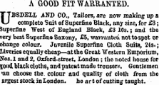 A GOOD FIT WARRANTED . UBSDELL AN © CO ., Tailors , are now making up a complete Suit of Superfine Black , any size , for £ 3 ; Superfine West of England Black , £ 3 10 s . ; and tbe very best Superfine Saxony , £ 5 , warranted not to spot or _change colour . Juvenile Superfine Cloth SuitB , 24 s . * Liveries equally cheap—atthe Great Western Emporium , Nos . l and 2 , Oxford-street , London ; the noted house for fond black cloths , and patent made trousers-. Gentlemen an choose the . colour and quality of cloth from the argest stock in Louden . he art of cutting taught .