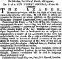 ' On this day , tlie 30 th of March , will appear , So . I . of a NEW " lYEEKLY JOURNAL , —Price 6 d . ENTITLED THE LEADER . Its master principle will be , the right of every opinion to its own free utterance . It will seek to afford _« xpresaon for the most advanced opinions on the questions of the day—Political , Economical , Social , and Religious . Contents ofthe Paper . —The News ofthe Day , treated so as to expand the most interesting into full and animated narrative -. accurate Commercial Intelligence ; discussion ofthe stiiTing topics of the day , national and local ; an Open Department free to Correspondents on subjects in controtrersy ; a review of the Literature of the day : not only in books , bat _: _< lso iu the events aud influences ofthe _literaiy world at *» - - -: _n- > and abroad - accounts of the progress of Science - elucidation of the Arts of the day , in cr iticism and description ; Original Essays ; Fiction , and occasionally Pictorial Illustrations . The LEaDEB will advocate the most complete forms of _national aud _indirijiinl freedom , in action , _industry , and thought . Earnest convictions will be told iu language direct and unequ _' _roi-al . Published by Joseph Clayton , Jun ., 2 C 5 , Strand , London .