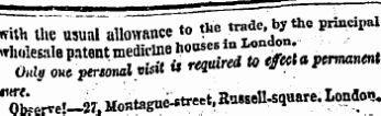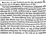 - _j Price lis ., or lour bottles in oue for 33 s ., by which Usis saved , also in £ 5 casus , which eaves -2112 s . ' : _; _Venereal contamination , if not at first eradicated , will _oftett remain secretly lurking in the system for years , and , although-for a while uiidiscovered _. _at _lorigth-break out upon the unhappy individual in ita '' most . dreadful forms ; or else , _uiisenn , internally endanger the very vital _oi'l jans of existence . To those suffering from the consequences which this disease may have left behind in the form of secondary symptoms , eruptions of the skin , blotches on the head aud faee , ulcerations and enlargement of the throat , tonsils , and threatened destruction of the nose , palate , Ac , _aodeii on the shin bones , or any of those painful _alYuctioni- arising from the dangerous effects ofthe indiscriminate use of mercury , or the evils of an imperfect