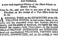 Just Published , A new andi _mportant Edition of the Silent Friend on Human FraiUy . Price 2 s . 6 d ., and sent free to any part of the United _Kinirdom on the receipt of a Post _Offise Order for Ss . Cd . A MEDICAL V 70 RK on the INFIRMITIES ofthe _GENERATIVE SYSTEM , in both sexes ; being v . n en-«; uirv into the concealed cause tliat destroys physical _eneri'y , and the ability of manhood , eve vigour has _esta . b'Uhcd her empire : —with Observations un the baneful effects of SOLITARY IXDDLGESCE and _INFECTION ; local and vonstitutioiial WEAKNESS , NERVOUS IRRITATION , CONSUMPTION , and on the partial or total