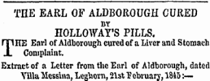THE E A RL OF A LDBOROUGH CURED BY HOLLOWAY'S PILLS . THE Earl of Aldborough cured of a Liver and Stomach Complaint . Extract of a Letter from the Earl of Aldborough , dated Villa Messina , Leghorn , 21 st February , 1845 : —