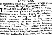 TO TAILORS . . By approbation ef Her Mont Excellent Majesty Queen Victoria and His Itoyal HIghiiMs Prince Albert . TIIE LONDON and PARIS FASHIONS for _Uinter , 1845 and 1840 , by READ and Co ., 13 , Hart-street , _Bloomsbury-squaro , London ; Berger , Holywell-street , Strand , London , and may be had of all Book _, tellers wheresoever residing ; a very superb Print , representing the most splendid exhibition in Europe , an Interior "View of the Colosseum , KejfMit'fi-parh _, London . This exquisitely executed and beautifully coloured Print will . be accompanied with fullsizeDrcss , Frock _. and Riding Coat Patterns ; also , Patterns ofthe New " Fashionable Polka Frock , and Locomotive