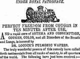 UNDER ROYAL PATRONAGE . PERFECT FREEDOM FROM COUGHS IN TEN MINUTES AFTER USE , AND a rapid cure of ASTHMA AND CONSUMPTION , COUGHS , COLDS , aud all Disorders of the Breath and Lungs , is insured by DR . LOCOCK'S PULMONIC WAFERS . The truly wonderful powers of this remedy have called forth testimonials from all ranks of society , in all quarters of the world . The following have just been received ;—