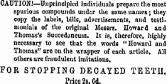 CAUTION . —Unprincipled Individuals prepare the mo 3 t spurious compounds uudtr the name uames ; they copy the labels , bills , advertisements , and testimonials of the original Messrs . Howard and Thomas ' s Succedaneum . It is , therefore , highly necessary to see that the words "Howard and Thomas" aro on the wrapper of each article . All others are fraudulent imitations . FOR STOPPING DECAYED TEETH . Price 2 s . fid .