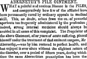 ABERNETITC'S PILE OINTMENT . WHAT a painful and noxious Disease is the PILES , and comparatively how fow of the afflicted have been permanently cured by ordinary appeals to medical skill . This , no doubt , arises from the us , ; of powerful aperients too frequently administered by the profession ; indeed , strong internal medicine should _always be avoided hi all cuses of this complaint . The Proprietor of the above Ointment , after years of acute suffering , placed himself uuder tbe treatment of that eminent surgeon , Mr Abernethy , —was by him restored to perfect health , and has enjoyed it ever since without the slightest return of the disorder , over a period of fifteen years , during which time the same Abcrnetliian prescription has been the