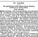 TO TAILORS By approbation of Her Majesty Queen Victoria , and H . R . H . Prince Albert . NOW READY , THE LONDON AND PARIS SPRING AND SUMMER FASHIONS for 1848 , bv Messrs BENJAMIN READ and Co ., 12 , Hart-street , Bloomsbury-squnre , _nearOxfordatvevt , London ; and by Q . _Besoer , Holywell-street , Strand ; m d all _Monkselloi'S , an exquisitely _exei'Hted and superbly coloured PRINT . The elegance of this Print excels any before published , accompanied with the Newest Style , and _extra-ritting Frock . Riding Dress , and Hunt . ing-Co ' it Patterns ; the must fashionable dress Waistcoat Pattern , and an extra-fitting Habit Pattern of-he newest and most elegant stylo of fashion . Every particular part explained ; method of _increasine ; and diminishing the whole for any size fully illustrated , manner of Cutting and Ma _^ iiiff up , and aU other information respecting Style and fashion . Price ] 0 s . post free Us . READ and Co . ' s new scientific system of Cutting for 1848 is ready , and will supersede everything ofthe kind heretofO' e conceived . All Mir _Plntce nrr > _nnrnVipreil anil