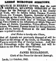 • LEEDS BOROUGH _SESSIONS NOTICE IS HEREBY GIVEN , that the next GENERAL QUARTER SESSIONS of the Peace for the Borough of Leeds , in the County of York , will be holden before Thomas Flower Ellis , the Younger , Esquire , Recorder of tbe said Borough , at the Court House , in Leeds , on Wednesday , the Twenty-sixth Day of October instant , at Two o'Clook in the Afternoon , at whioh Time and Place all Jurors , Constables , Polioe-officers , Prosecutors , Witnesses , Persons bound by Recognizances , and others baving Business at the said Sessions are required to attend . And Notice is hereby also Given , that all Appeals not previously disposed of will be beard at the sitting of the Court , on Thursday , the Twenty-seventh Day of October instant . And that all Proceedings under the Highway Act will be taken on the First Day of the Sesssion . By Order , JAMES RICHARDSON , Clerk of the Peace for the said Borough Leeds , l = t October , 1842 .