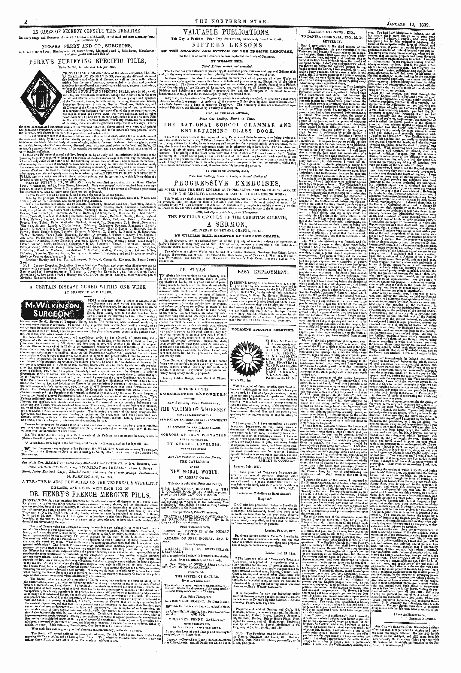 VALUABLE PUBLICATIONS . This Day ia Published , Price Two Shillings , handsomely bound in Cloth , FIFTEEN LESSONS OV THE AKALOGY AND SYNTAX OF THB ENGLISH LANGUAGE , for the Use of Adult Perrons whe have neglected the Study of Grammar . BY WILilAW HILL . Third Edition revised and amended . The Author has great pleasure in presenting , at a reduced price , tbis new and improved Edition « fh ^ work , to the many who have enquired for it , during the short time it has been ent of print . In these Lessons , the sbsmrd and unmeaning technicalities which pervade all ether Wprkft on Grammar are exchanged for teims which have a definite and precise meaniug , illustrative of the thing * lhey represent . The Parts of speech are arranged en an entirely new Principle , fouuded on a Philosophical Conwideration of the Nature of Language , and applicable to ail Language * . The necessary Divisions and Subdivisions are rationally accounted for—and the Principles of Universal Grammar demonstrated so fully , that the meanest capacity may understand them . In Syntax , tbe formation of the English Language is exclusively consulted , without any unnecessary reference t » otbtr Languages . A majority of the numerous Bule * given in ntoat Grnn . niars are shown to be little better than a heap of senseless Tautology . The necessary RultB are demonstrated upon rational Principles , and illustrated by a variety of Examples . . ALSO , BT THE SAME AUTHOR , Price One Shilling , Bound in Cl » th } THE RATIONAL SCHOOL GRAMMAR AND ENTERTAINING CLASS BOOK . This "Wori vras -written at the request of many Parents and Schoolmasters , who being desirous ot tmng the Author ' s former work , "Fifteen Lessons , &c . " in the Education of their children , complaint d that , being written lor Adults , its ctyle was not well nuited for the youthful mind ; they r egretted , therelore , that it could not be made so universally useful as it otherwise might have been . For the obviution therefore , of tbis objection , the "Rational School Grammar" is ho written a * t » amuse while it instructs . The principle of the Work is preci ^ elv that of tbe Author ' s "Fifteen Lessons , &c . " Inking oat merely tbe Controverml part , all tbat can be stid ot tbat Work may be K « id , with equal forte and propriety of this ; while it ? style and diction are perfectly wiibin the scope of an ordinary youthful n . iiul in which they are calculated to excite a deep interest » nd , consequently , to rivet the attention , whilst they communicate information which must , therefore , indelibly impress the " memory . BY THE SAME AUTHOR , ALSO , Price One Shilling , bound in Cloth , a Second Edition of PROGREteSIYE EXERCISES , SELECTED FROM THE BEST ENGLISH AUTHORS , AND SO ARRANGED AS TO ACCORD WITH THE RESPECTIVE LESSONS IN EACH OF THE FOREGOING WORKS . This "Work is a Taluable and ntcessary accompaniment to either or both of the foregoing ones . It i > so arranged that tbe exercises therein contained suit either the " Rational School Grammar" for children or tbe " Filteen Lessons' for Adults . A gradation of principle . * is carefully ol :. » n vrd ; * o that no lewon of the exercises fchall anticipate anyinformaiion in succeeding lechon ? ol the Grammar . Also , this day is published , price Thretptnce , THE PECULIAR SANCTITY OF 'IHE CHRISTIAN SABBATH , A SERMON , DELIVERED IN BETHEL CHAPEL , HULL , » V WIIJUIAM HZXX , MINISTER OF 1 HE SAID CHAPEL . In thiit diwourse , tbe long agitated question of the propriety of teaching writing and accounts , in Sabbath School .-, U completely k « ht rest . Tbe au'bority , precepts atd practice of the Lonl Jesus Christ are shewn to have a direct tendency to the Establi .-linient oi the CuBtom . The whole of the above Worlo may he bad of Joshua Hobson , Northern Star Office , Leeds , af Abel Heywood , and Messrs . Bancks and Co . MancheMer ; or of Cleave , 1 , Shoe , lane , Hodsln ! 112 , F '^ p' -street , aud Simpkin aud JlARtHALL , Stationer ' s Kali Court . x onaon ; aj . d all otce : Booksellers .