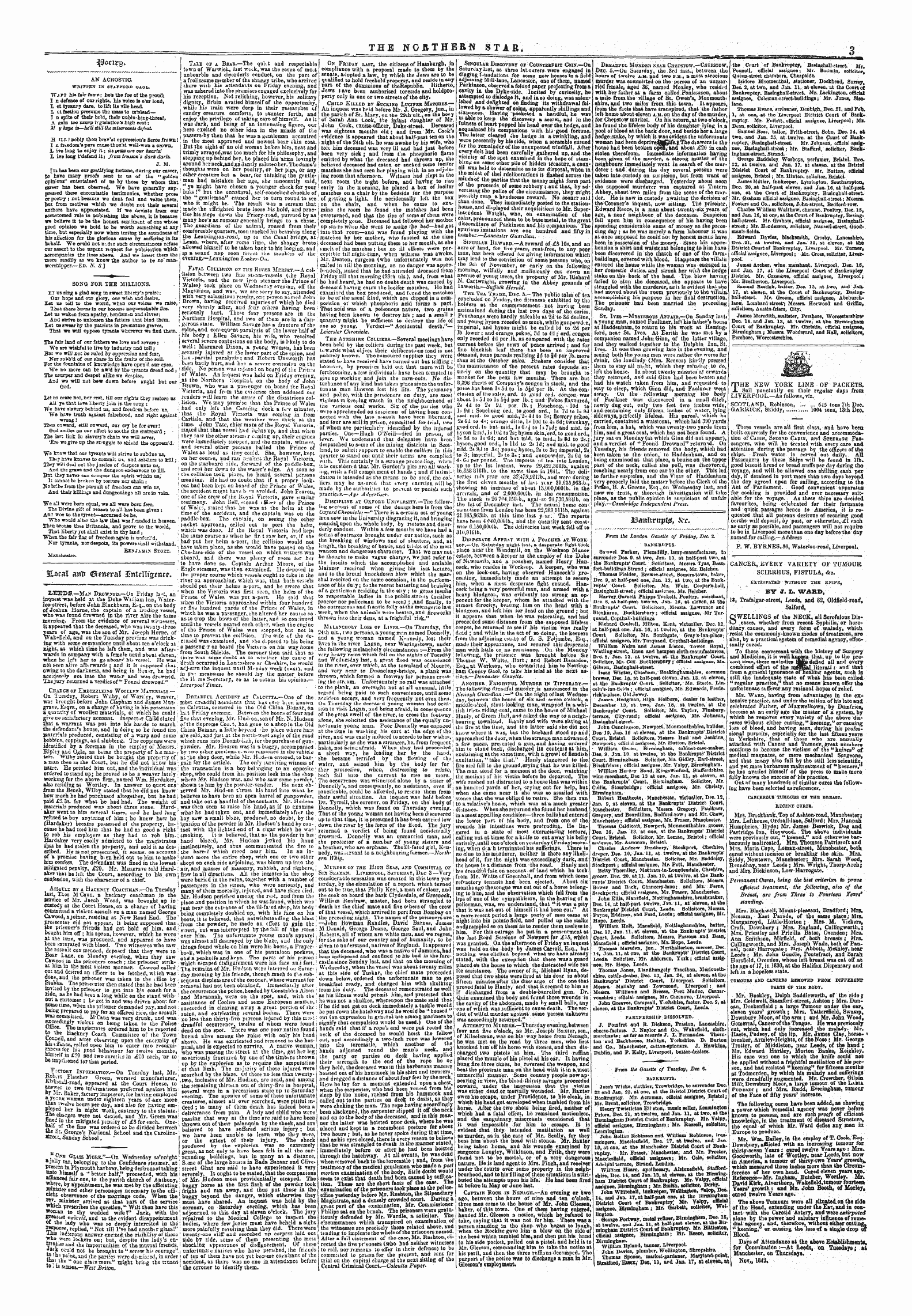 CANCER , EVERY VARIETY OF TUMOUR SCIRRHUS , FISTULA , < feo . EXTIHPAXED WITHOUT THE KNIFE , B 7 J . L WARD , 1 « , Trafalgar-street , Leeds , and 82 , Oldfield-road , Salfbrd , \ Q WELLINGS of the NECK , all Scrofulous Dis-\ D ^ eases , whether from recent Syphilis , or hereditary causes , and every fotm of malady , / which resist the commonly-known modes of treatment , are alBO , by a , practical system of remedial agency , effao- . tually cured . ¦' . ;¦• ¦ . To those conversant with , the history of Surgery and Medicine , it is well known that , up to the preeont timo , thcoo maladies tMEg defied all and every combined effort of the nm | Hkl literati ; and that from a general ignoranceloTnealing agents , such is still the inadequate state of what has been called " regular practice , " that no means known offer the unfortunatesufferer'anyrational hopest ) frelief . Mr . Wabdj having from advantages in the extensive practice , and under the tuition of his late and celebrated Father , of Maxwell town , by Dumfries , become at an early age the master of a system , by which he removes every variety of the above diseases without either cutting , "keening , " or causing loss of blood , and haying seen , during his professional pursuits , especially for the last fifteen years in Yorkshire , that of those ¦ who are annually attacked with Cancer and Tumour , great numbers continue to become the victims of the " knives" of medical magnates , or mere mechanical Surgeons , and that many also fall by the still less scientifio , and yet more barbarous maltreatment of " keeners , ' * he has availed himself of the press to make more fully known the success of his practice . Out of many hundreds of similar cures the following have been selected as references . CANCEROUl TBMODHS O » THB BREAST . EECENT CURE ! . Mrs . Brockbank , Top of A 6 hton-road , Manchester ; Mrs . Lofihouse , Ordsall-lane , Salford ; Mrs . Hannah Humphries , Hyde ; Mr . James Beswiok , Dog and Partridge Inn Hejwood ; The above individuals were previously out , " keened , " and otherwise bar-> arously maltreated . Mra . Thomson Patrioroft and Mrs . Maria Cope , Lomax-street , Manchester , both cured without incision or breaking the skin . Mrs . Siddy , Newtown , Manchester ; Mrs . Sarah Wood , Roundhay , near Leeds ; Mrs . Wright , Thorp-Arch ; and Mrs . Dickinson , Low-Harrogate . Permanent Cures , being the best criterion io prove efficient treatment ^ the following \ a / so 0 / the Breast , are from Three to Fourteen Year ? standing , Mrs . Black well , Mount-pleasant , Bradford ; Mrs . Ne « sam , East Parade , of the game place ; Mrg . Murgatroyd , LHtle-Horton ; Mrs . M . Vicbera , Croft , Dewsbury ; Mrs . England , Cullingworth , ; Mrs . Priestley and Pricilla Bates , Ovendeh ; Mrs . Ann Smithson , Mirfield , of both breasts ; Mrs . Cullingworth , and Mrs . Joseph Wade , both of Paanol , near ; Harrogate ; Mrs . Abbott , Methley , near Leeds ; Mr . John Gundle , Pontefract , and Sarah Horsfield , Ovenden , whose left breast was cut off at the age of 17 , in 1830 , at the Halifax Dispensary and left ' in a hopeless Btate . TVHOVBS AND CANCEBS REMOVED PBOM DliPFEBENP . PAET 8 OF THE BODY . Mr . Buckley , Delph Saddleworth , of the side ; Mrs . Cold well , Stamford-street , Ashton : Mrs . Duncan , Duokenfield ; a large Tumour under the ear ^ eleven years' growth ; Mrs . Tattersfield , Swamp , Dewsbury Moor , of the arm ; and Mr . John Wood , Gomersal , Cancer of the Tongue . He waa previously cut , wh ' tch bad only increased the malady . Mr . Haste , Pudsey , of the lip . Mr . James Clay , horse- ' breaker , Arm ley-Heights , of the Nose ; Mr . George Trotter , of Middleton , near Leeds , of the hand ; Mr . Edward Hartley , Morton Banks , Keighley . His tase was one to which the knife could not be applied without a frigbtfnl mutilation ot his person , and had resisted •• keening" for fifteeen months at Todmorden , by which hia malady and sufferings were dreadfully augmented . Mr . Cromher , Gilpin HilV-, Dewsbnry Moor , a large tumour of the Labi A Pudemh ; and Mrs . Radd , Everingham , tumour of the Face of fifty years ' inoreage . The followinc enres ^ have been added , as shewing a power which remedial agency was never before known to possesSj and are such proofs ot efficient knowledge , in the treatment of diseased Structure , the equal of which Mr . Ward defies any man in Europe to produce . M * . Wm . Bailey , iA ihd « Bapl « y of T . Cook , Esq . Dewsbnry , a * icted with an increasing tumour for thirty-seren Years : cured twelve Years ago : Mrs . Gooaworth , late of Wortley , near Leeds , bat now in America , a tumour of thirty-two Years' growth which measured three inches more than the Circumference of her own head . Cured eleven years ago . Reference—Mr . Ingham , Butcher , Wortley . Mr . David Kirk , Alverthorp , Wakefield , tumour fourteea Years ' growth : and Mr . John Booth , of Morley , enred tw # lve Years ago . : ; The above Tumours were all situated , on the side of the Head , extending under the Ear , and in contact with the Carotid Artery , and were extirpated alone by the power and salutary influence of remedial agency , and , therefore , without either cutting , " keening , " or causing the loss of a single drop Of Blood , ; . . ¦ - ¦ . ¦ ; . .. * ¦ : . '¦ ; ,. ; ' :. - - ' . ¦ ¦; ¦¦ \ : ; Days of Attendance at the above Establishments , for Consultation : —At Leeds , on Tuesdays j afc Manchester , on Thursdays , . , Noy « 18 « . : ; - :. v : ;; - . ¦ ¦ ¦ -. . ¦ - ¦¦ : ¦ - ¦ ;¦ : ' ¦