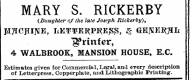 MARY S . RICKERBY i { Daughter 0 / the late Joseph Rickerby ) , JI 7 ICPIJVIE , IiETTERPl ^ EJSJS , § GEJVIK ^ L j IJfrinfer , 4 WALBROOK , MANSION HOUSE , E . C . Estimates of Letterpress given , for Copperp Commercial late , and , Lepral Lithograph , and every ic Printing description .