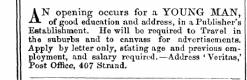 AN opening occurs for a YOUNG MAN , of good education and address , in a Publisher ' s Establishment . He will bo required to Travel in the suburbs and to canvass for advertisements . Apply by letter only , stating age and previous emp Post loyment Office , and , 407 salary Strand requ . ired . —Address ' Voritas , '