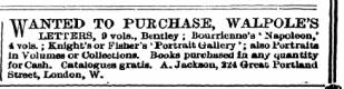 ¦ WANTED » ' LETTERS , TO 0 vols PUR ., Bentley CHASE ; Bourrienne , WALPOUS ' a * Napoleon 'S 4 vols . ; Knight ' s or Fisher ' s ' Portrait Gallery *; also Portrait * for in Volumes Cash . Catalogues or Collection gratia * . . Books A . Jackson purchased , 224 la Gtreat any Portland quantity I I Street , London , W . I