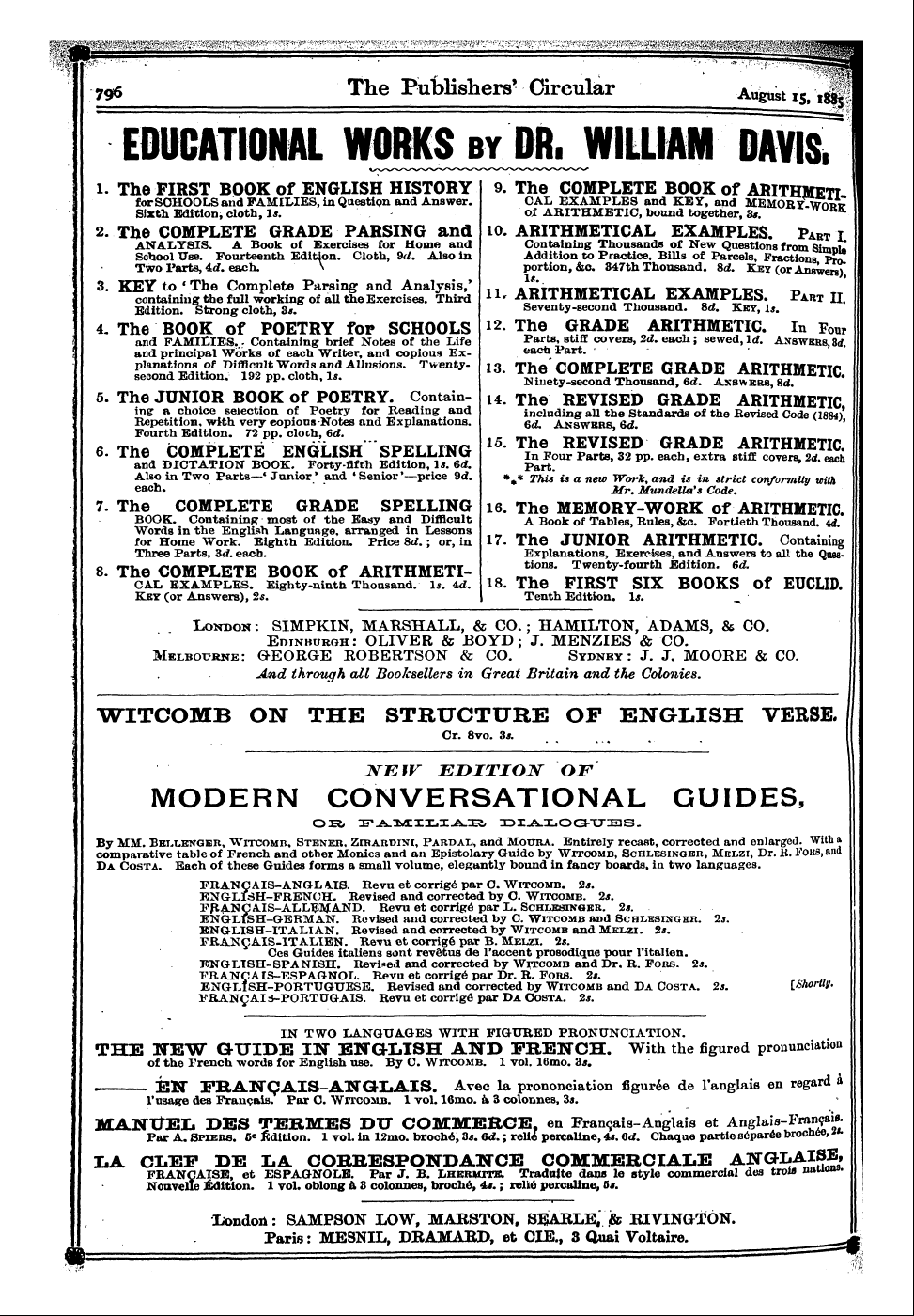 EDUCATIONAL WORKS by DR , WILLIAM DAVIS , I . The FIRST BOOK of ENGLISH HISTORY 9 . The COMPLETE BOOK of ARITHMETT I for Sixth SCHOOLS Edition , and clot FAMILIES h , 1 * . , in Question and Answer . of CAL ARITHMETIC EXAMPLES , and bound KEY together , and , MEMORY 3 * . ^ wax Wnpir . II I II 2 . The COMPLETE GRADE PARSING and 10 . ARITHMETICAL EXAMPLES , Part I I ANALYSIS School Use . . Fourteenth A Book of Edition Exercises . Cloth for , 9 d Home . Also and in Addition Containing to Thousands Practice , Bills of New of Parcels Questions , Fractions from SimoliI Pm ! I I Two Parts , 4 tf . each . \ portion , & c . 347 th Thousand . 8 d . Key ( or Answer ^* I 3 . KEY containin to ' Th g the e full Comp working lete Parsing of all the Exercises and Anal . ysis Third , ' AKl AmTHMFTTPAT inmJillUALi FVAMPT UiLAJUrij & T 7 Q b . t Par » t II tt . ' i Edition . Strong cloth , 3 * . Seventy-second Thousand . 8 d . Key , 1 * . 4 . The BOOK of POETRY for SCHOOLS * The GRADE ARITHMETIC . In Four I ? second and S and ^^ principal FAMILIES it . tuition ^ n ^ Work . . S IVJ - ^ Containing s nt of . ^ each clotn iSh Writer ^ brief l * . ^ 11810118 , Notes and copious of ' T the wenty Life Ex - 13 . The eaca Parts Part COMPLETE , stiff . covers , 2 d . GRADE each ; sewed ARITHMETIC , Id . Answers 3 d . The JUNIOR BOOK pp of POETRY , . Contain- 14 . jhe Ninety REVISED -second Thousand GRADE , 6 d . Answers ARITHMETIC , 8 d . 15 . Repetition ing a choice , with selection very copious of Poetry -Notes and for Explanations Reading and . including g ^ Answers all the 6 d Standards of the Bevised Code ( 1884 )' 6 Th a Fourth ^ Edition S ^ FS 72 pp . cloth ^ Ff , 6 d . ^ L SSSS ! ^ JSSSa REVISPD . 2 ORADF ^^ APTTWMPTTr ™ ES Also each ^ in Two Parts—* Junior * and * Senior' —price 9 d . * ^ * Tflis ' ^ a new Work . Mundella , and is 's in Code strict . conformity with 7 . The COMPLETE GRADE SPELLING 16 . The MEMORY-WORK of ARITHMETIC . I Words for BOOK Home . in Containing the Work English . Eighth most Language of Edition the , arranged . Easy Price and 8 rf . Difficult Lessons ; or , in 17 . The A Book JUNIOR ' » of M Ta » r # bl ** es % , Ru ARITHMETIC m . l * es + * , ww & , 'r c < . m * Fortieth < * rw , m . Thousand Containing ^ . 4 rf . Three Parts , 3 d . each . Explanations , Exercises , and Answers to all the Qoes * 8 . Th e COMPLETE EXAMPLES . Eighty BOOK -ninth of Thousand ARITHMETI . 1 * . 4 - 18 . The * ' FIRST Z ^ T'Trt SIX E BOOKS S ™^ Of ^ EUCLID ™^ rT . Key ( or Answers ) , 2 s . Tenth Edition . Is . ^ Ix > nuon : SIMPKIN , MARSHALL , & CO . ; HAMILTON , ADAMS , & CO . Edinburgh : OLIVER & BO YD ; J . MENZIES & CO . Melbourne : GKEORGKE ROBERTSON & CO . Sydney : J . J . MOORE & CO . And through all BooJcsellers in Great Britain and the Colonies .
