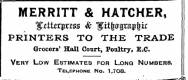 MERRITT & HATCHER , ijeiterjrm *• ^ xt ^ xxx ^ u PRINTERS TO THE TRADE Grocers' Hall Court , Poultry , E ; C Very Low Estimates for Long Numbers . Telephone No . 1 , 7 O 8 .